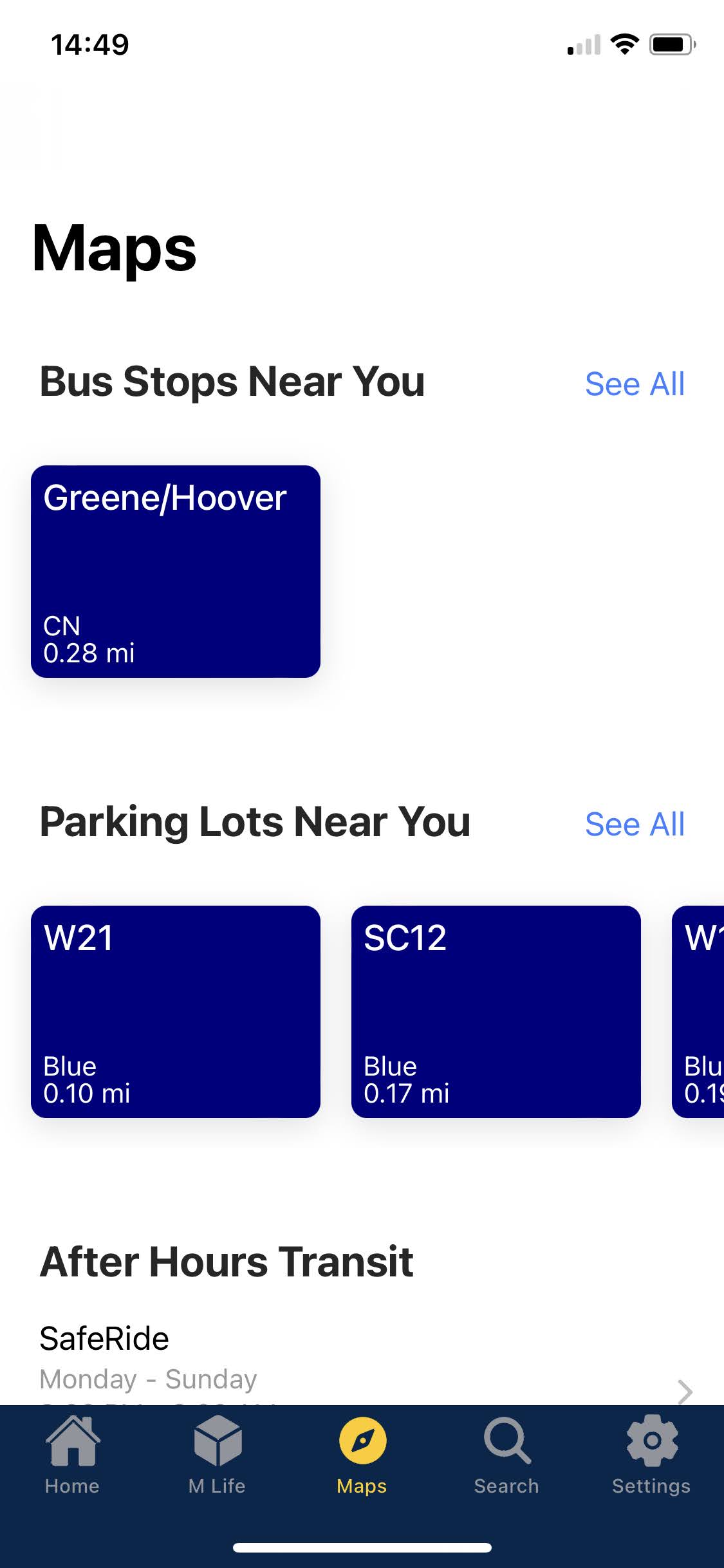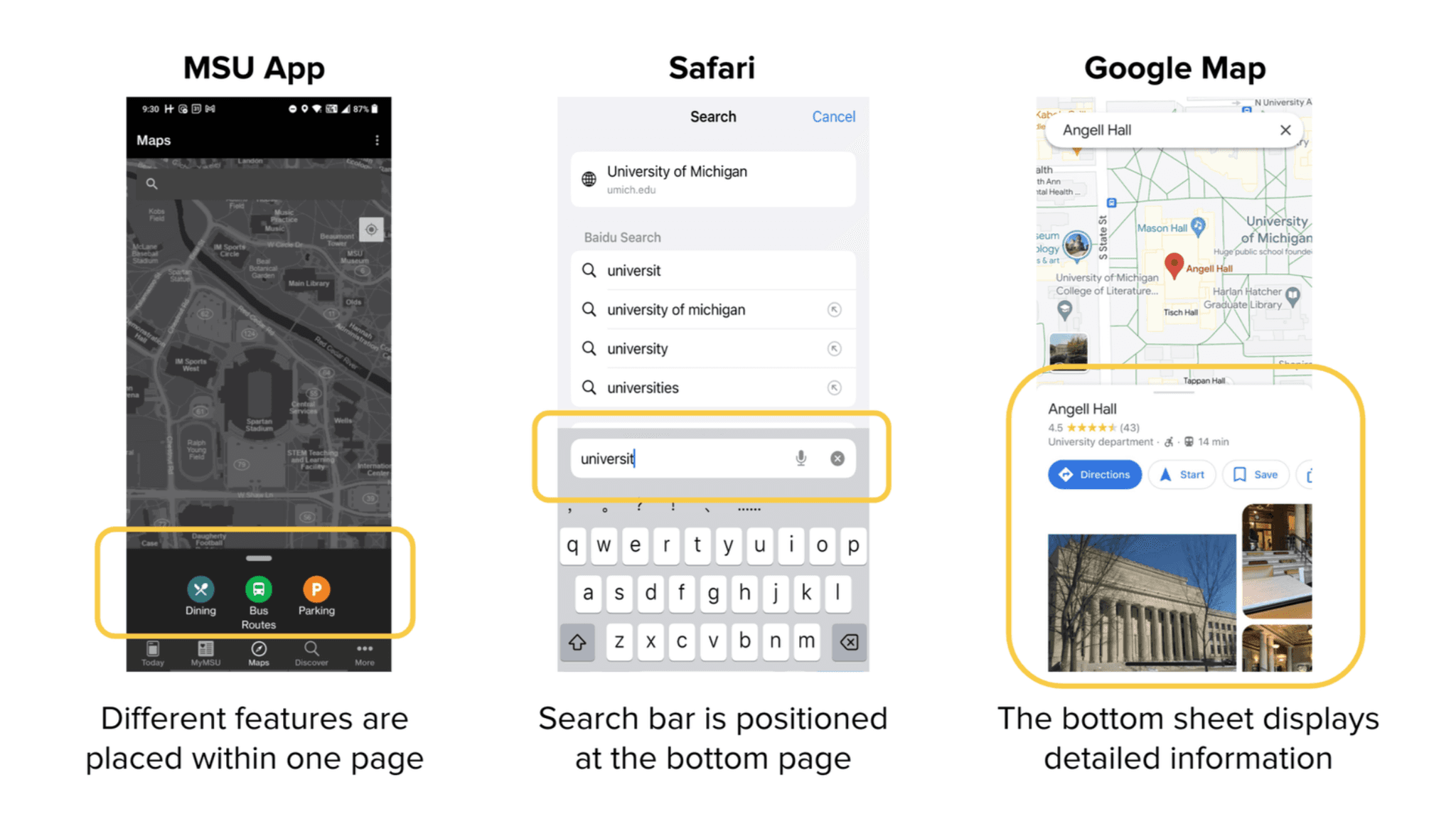 We analyzed how other apps organize and present information, including the M-Bus app, Penn State’s and Michigan State’s university apps. We also took inspiration from widely used apps like Safari, Google Maps, and Apple Maps to explore familiar patterns and intuitive design approaches.