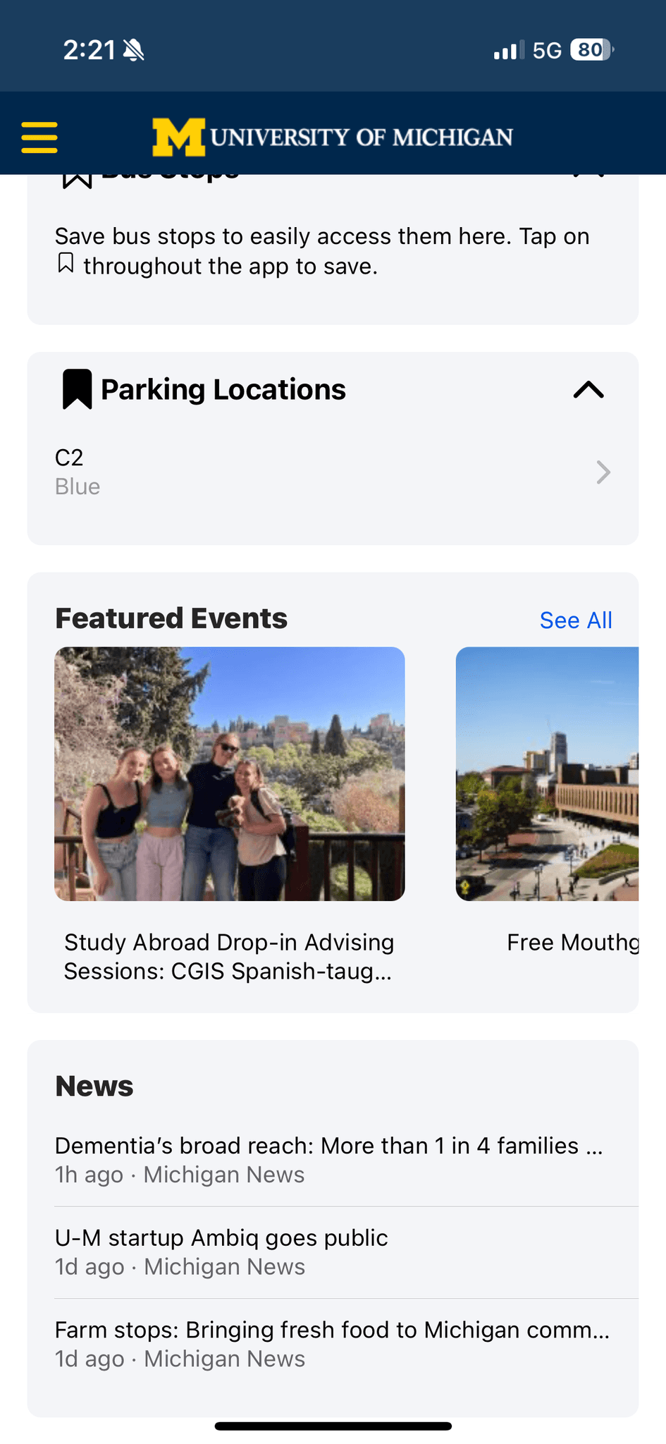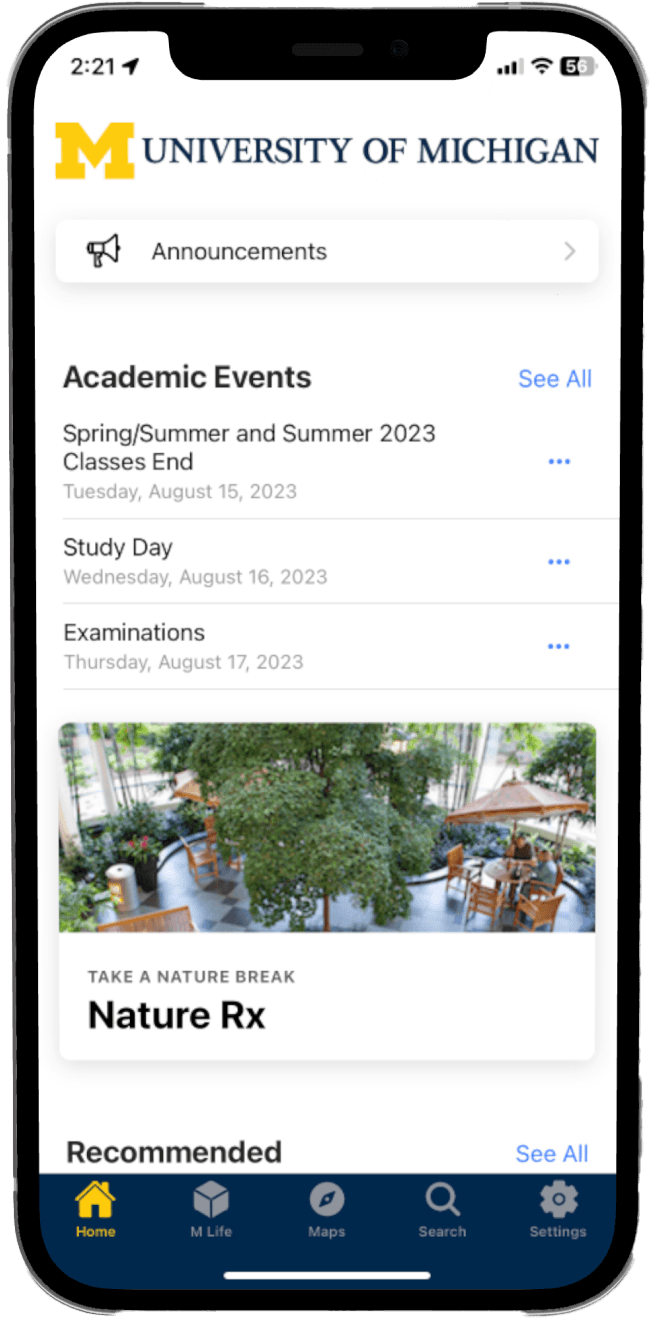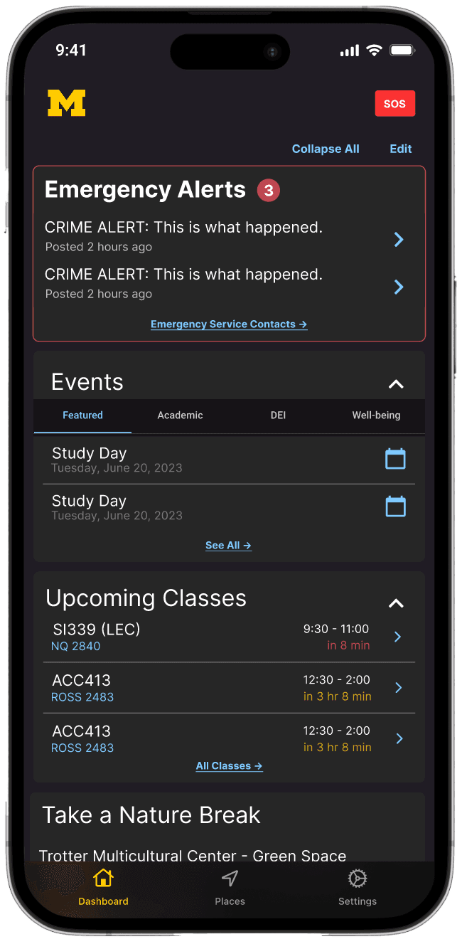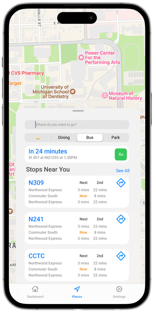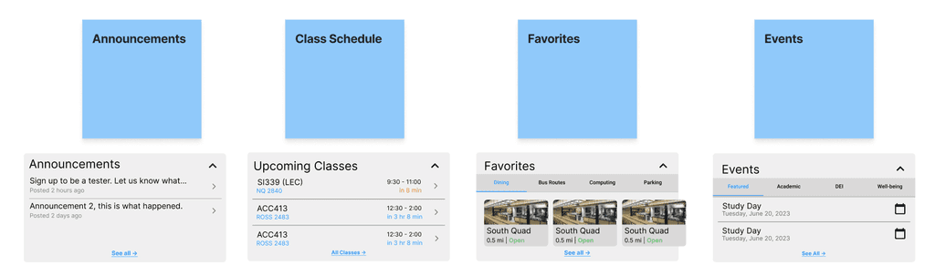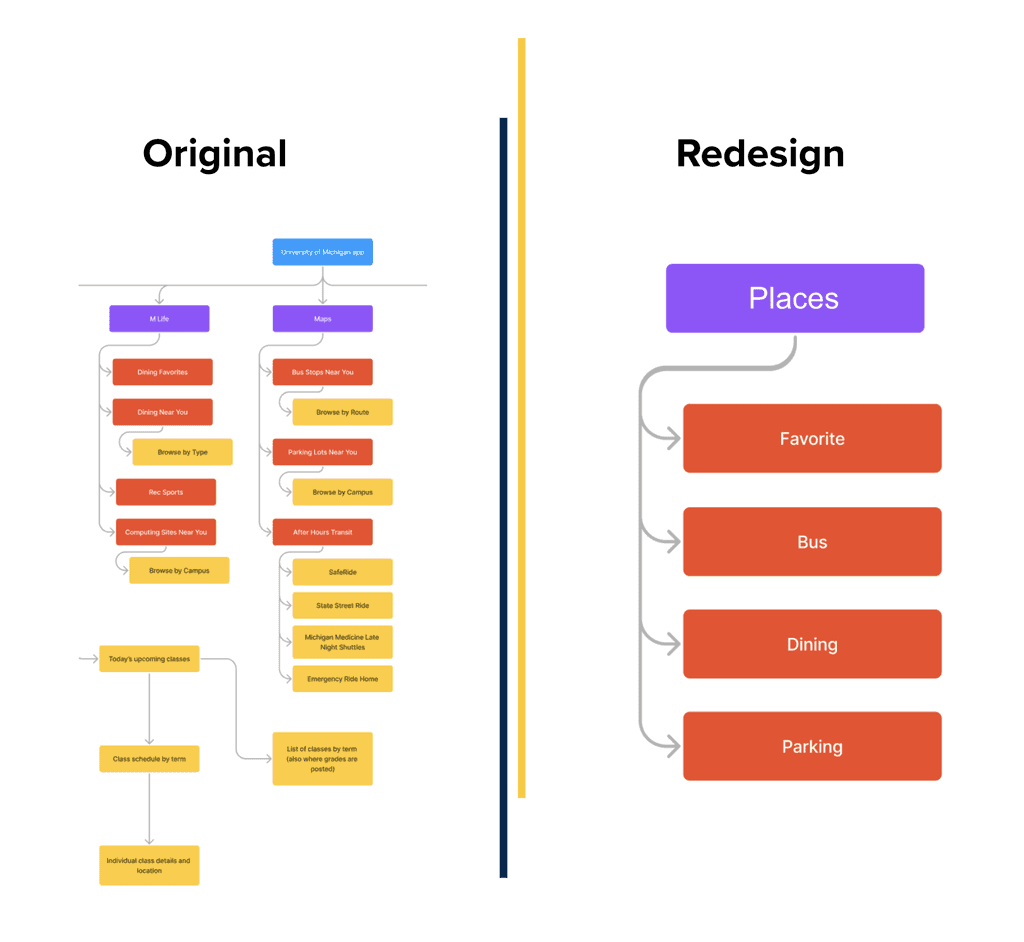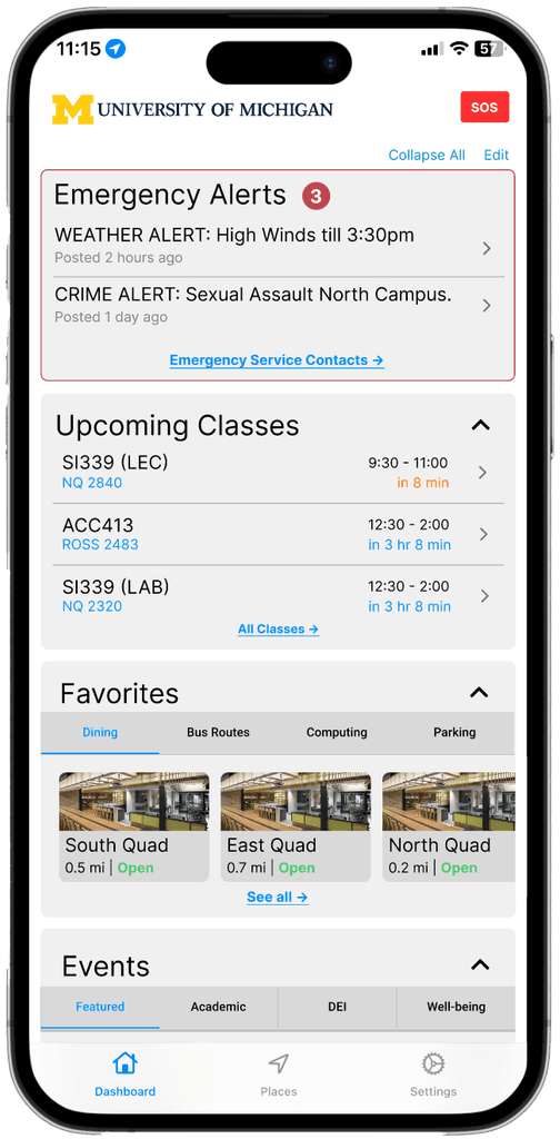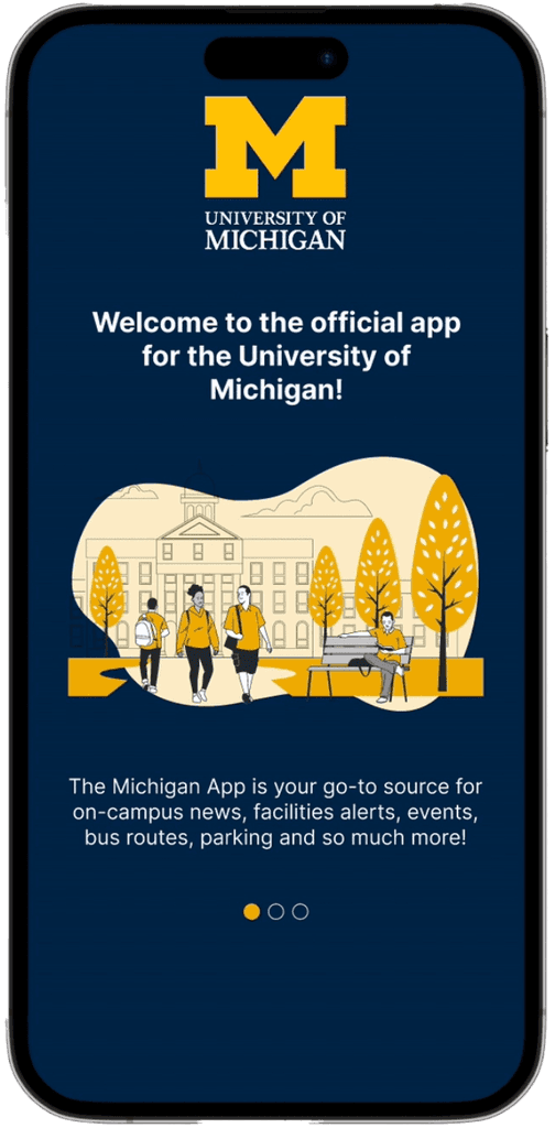 During my 3-month internship at the University of Michigan (May–Aug 2023), I collaborated with the UX team to redesign the Michigan App, which brings together class schedules, transit, dining, parking, and events. Together, we researched how people used the app, identified key pain points, and developed a smoother, more scalable design that simplified navigation, improved engagement, and created a more connected campus experience.