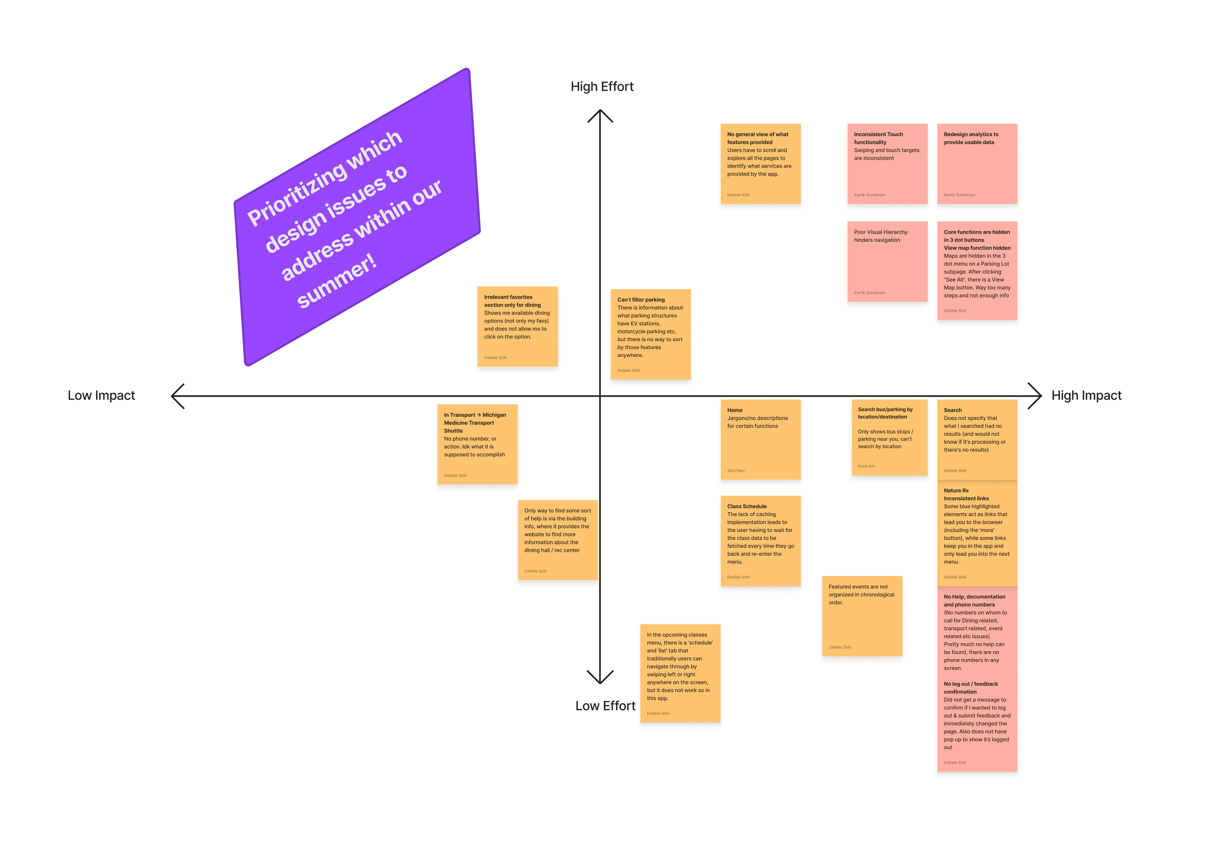 After identifying key issues, we used an effort-impact matrix to prioritize which features to work on during our internship. We chose to focus on items that offered high impact but required relatively low effort, ensuring meaningful improvements within a limited timeframe.