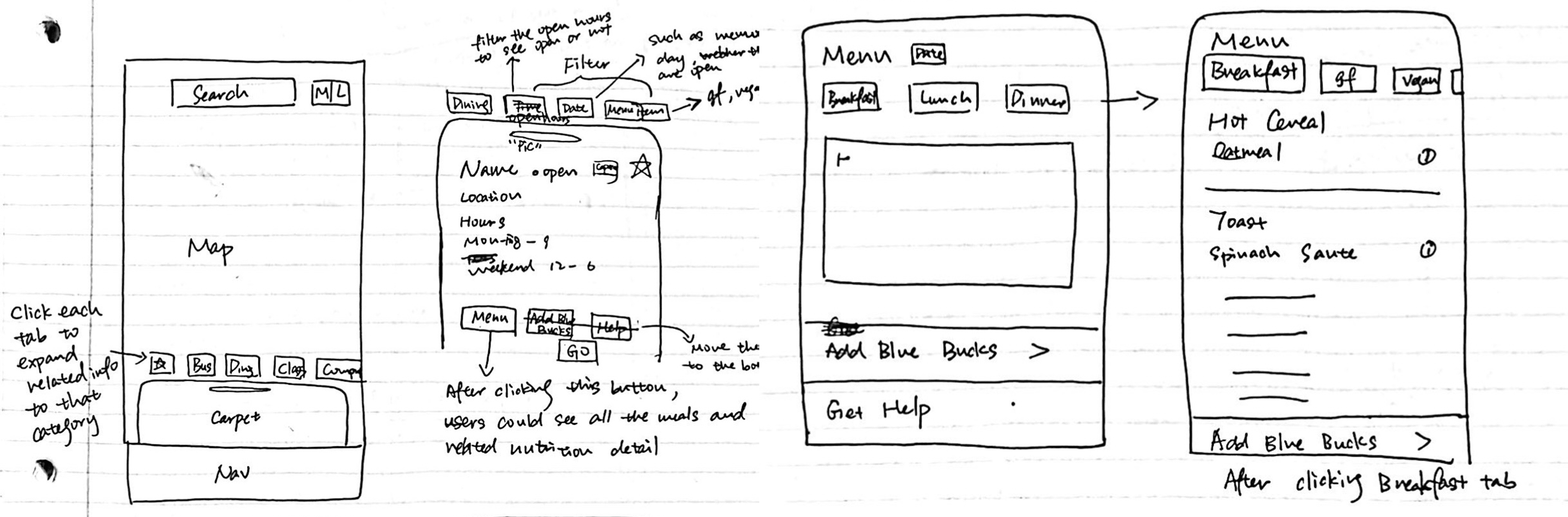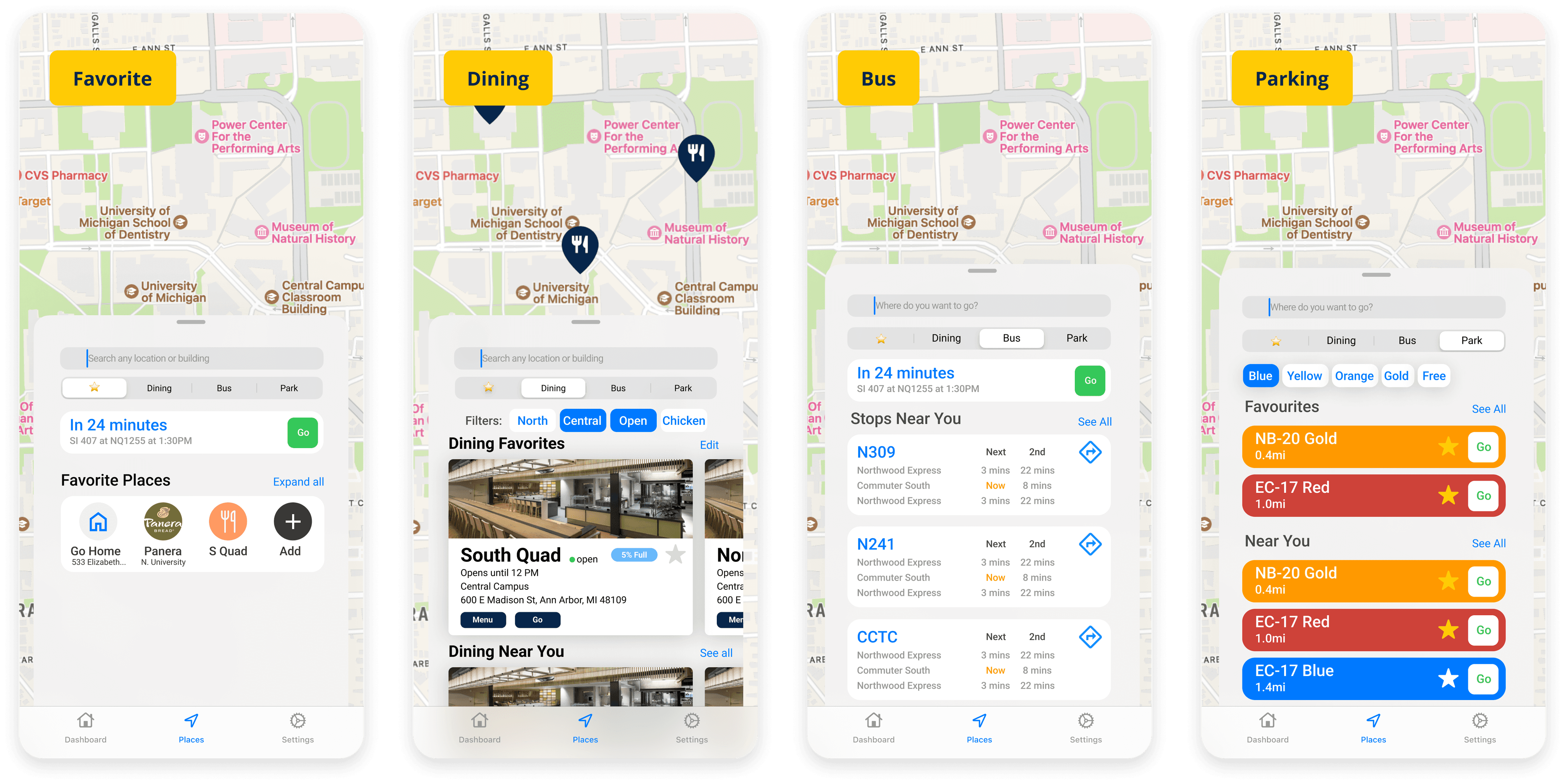 The Places page was a key area I focused on. I explored different ways to bring all four location-based features—bus stops, dining, recreation, and parking—into one page. I experimented with various layouts, including tabs, dropdowns, and segmented controls. After testing different options, I found that a "carpet" design worked best. It allows users to switch between categories without refreshing the map, making navigation smoother and the interface easier to understand.
