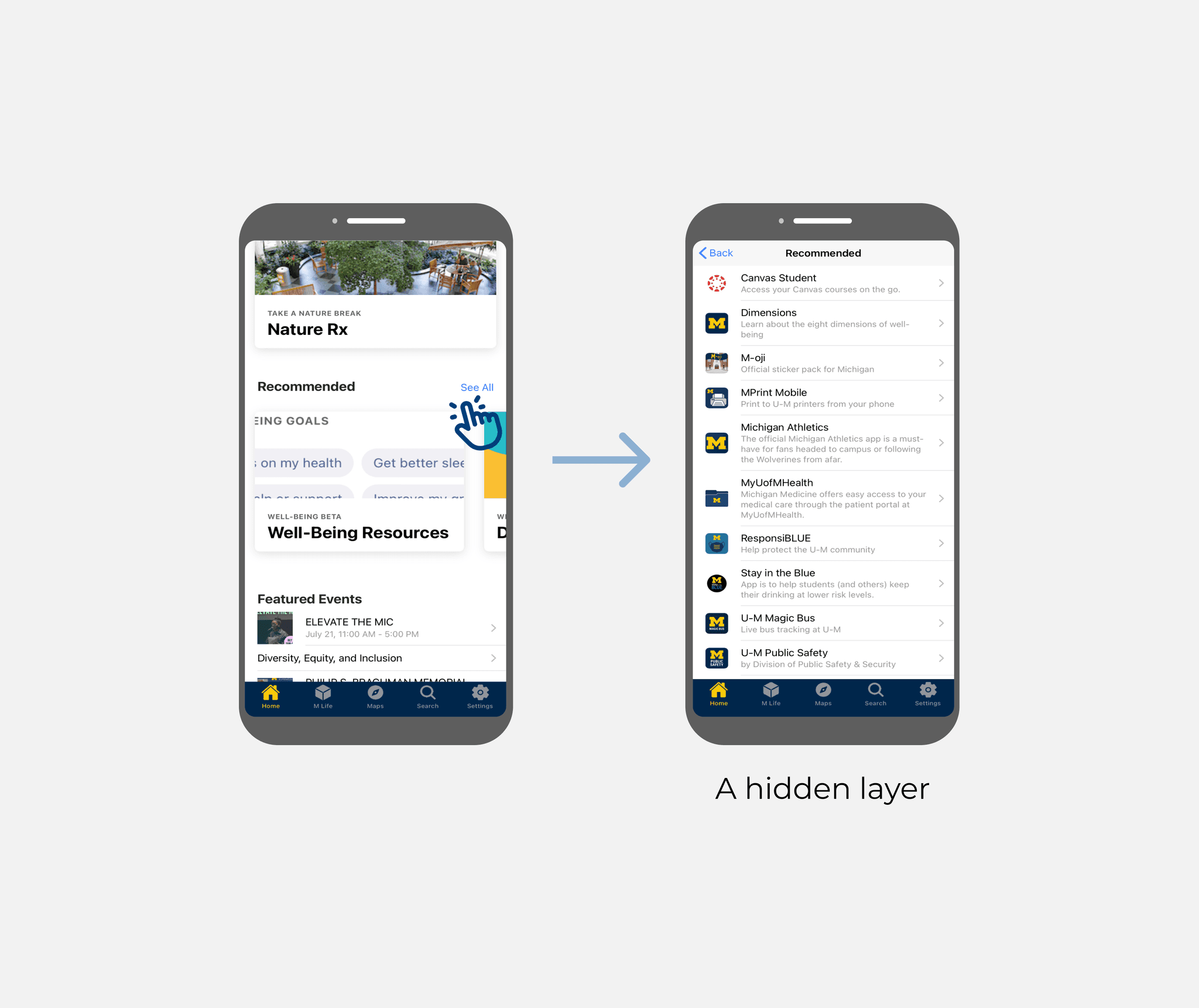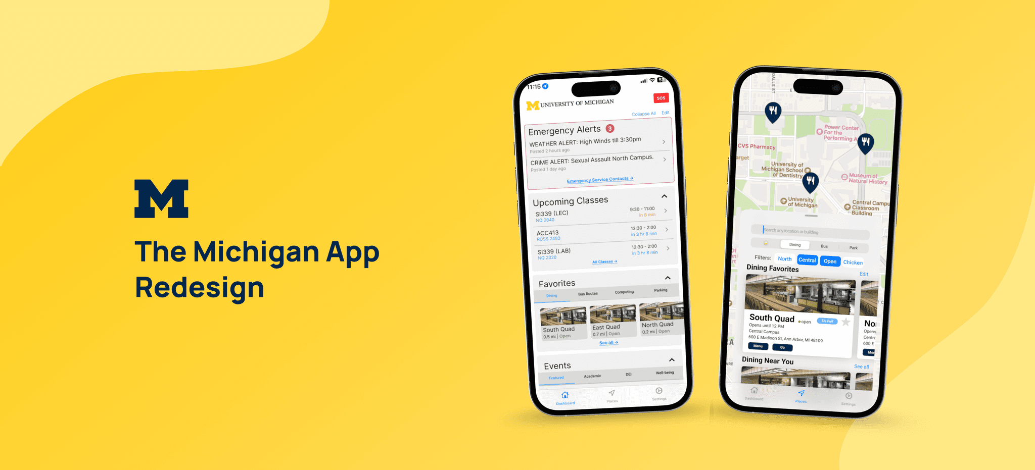 After completing the redesign, we presented our work to the Michigan App development team and university stakeholders. Several of our proposed solutions, including the modular homepage and map-based navigation, were approved for implementation.